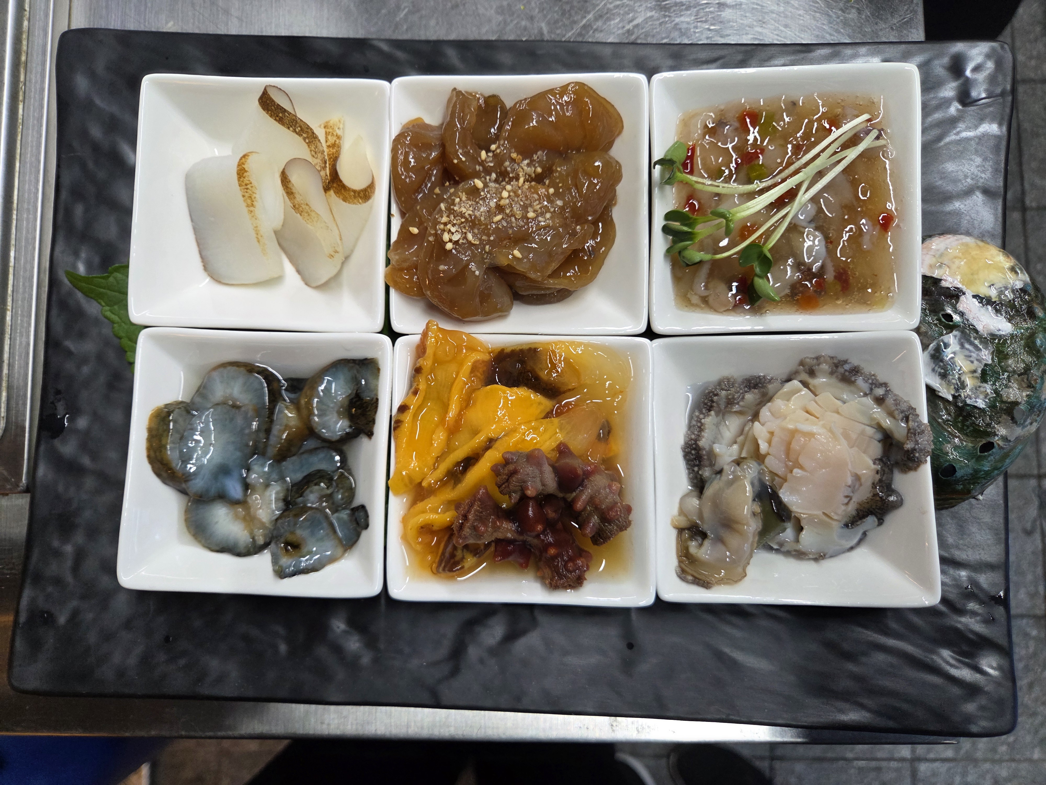 모듬 해물(전복, 해삼, 멍게, 타코와사비, 간장새우)